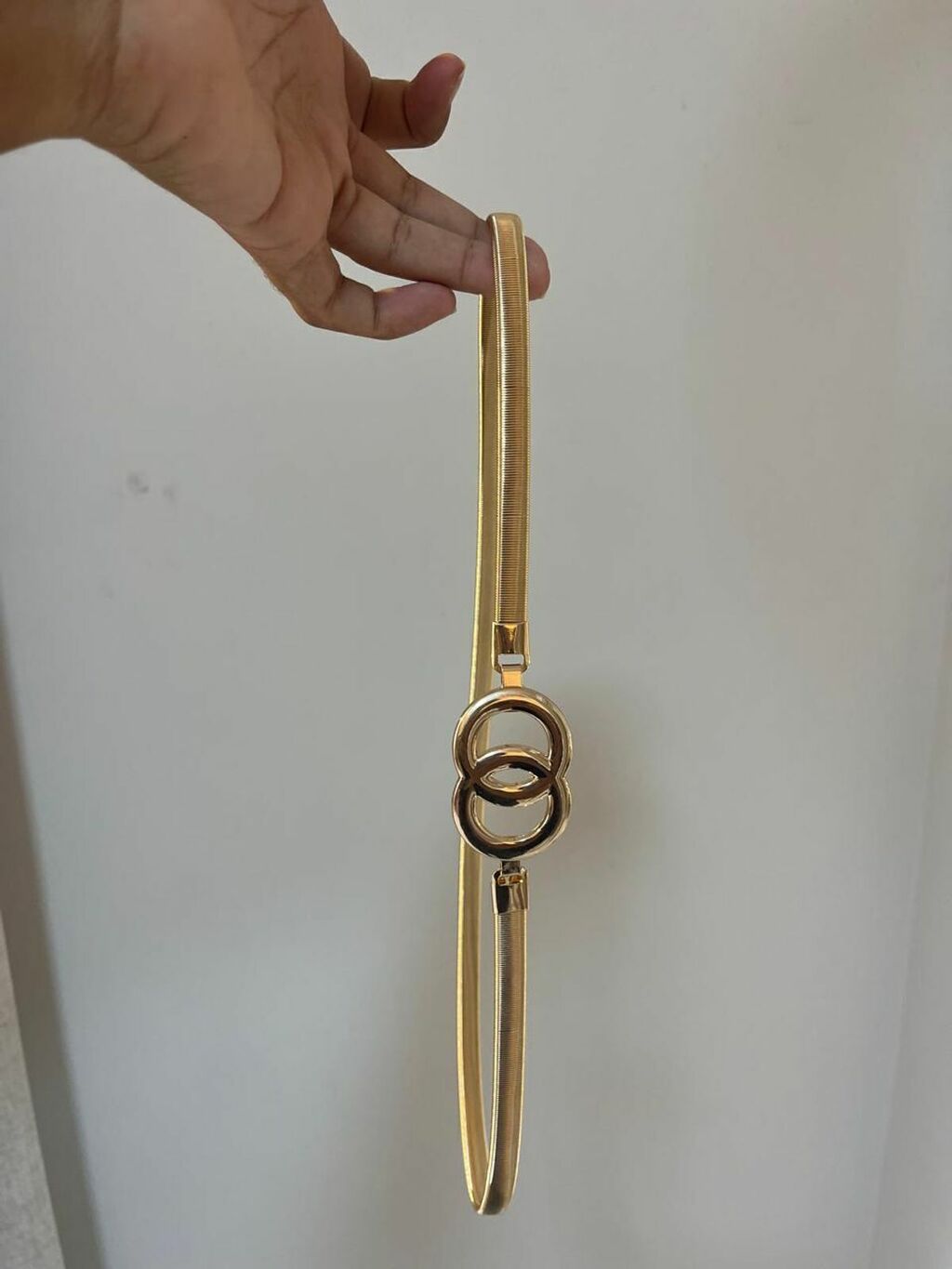 Cinto metálico fino na cor dourada com estrutura flexível e acabamento brilhante. A fivela frontal é composta por dois elos ovais entrelaçados, criando um visual moderno e delicado. O modelo possui elástico interno, garantindo um ajuste confortável e versátil. Ideal para marcar a cintura em vestidos, camisas ou looks de alfaiataria, elevando a produção com um toque de luxo minimalista.