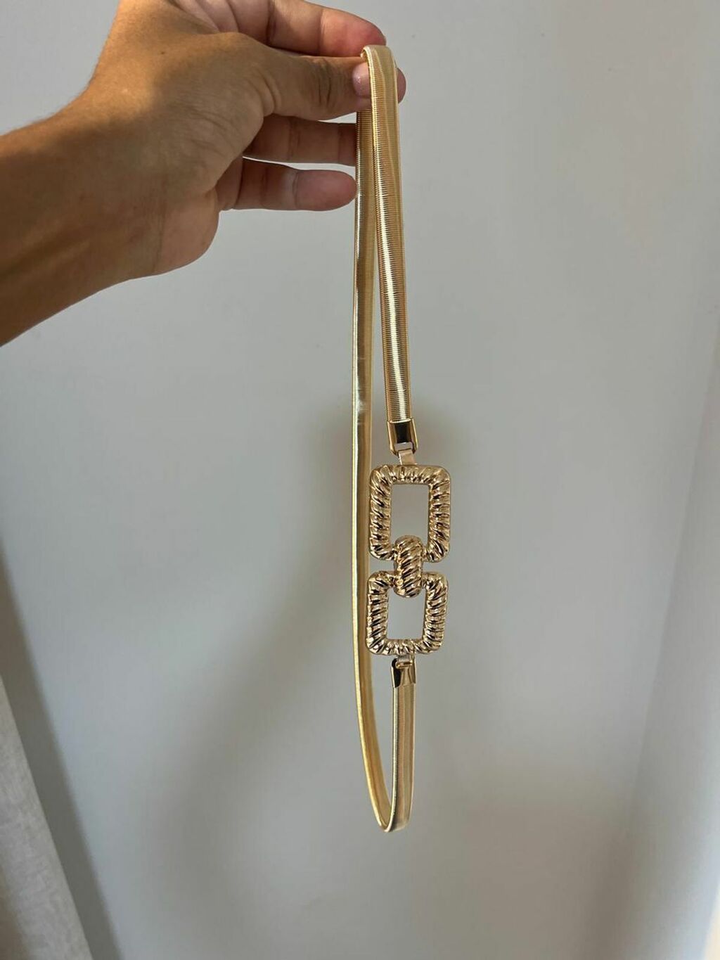 Cinto fino metálico com acabamento dourado brilhante, estruturado com leve elasticidade para ajuste confortável ao corpo. O destaque fica por conta da fivela decorativa composta por dois elos quadrados texturizados, unidos por um elo central em espiral, criando um visual moderno e elegante. Ideal para complementar vestidos, macacões ou produções de alfaiataria com um toque refinado.