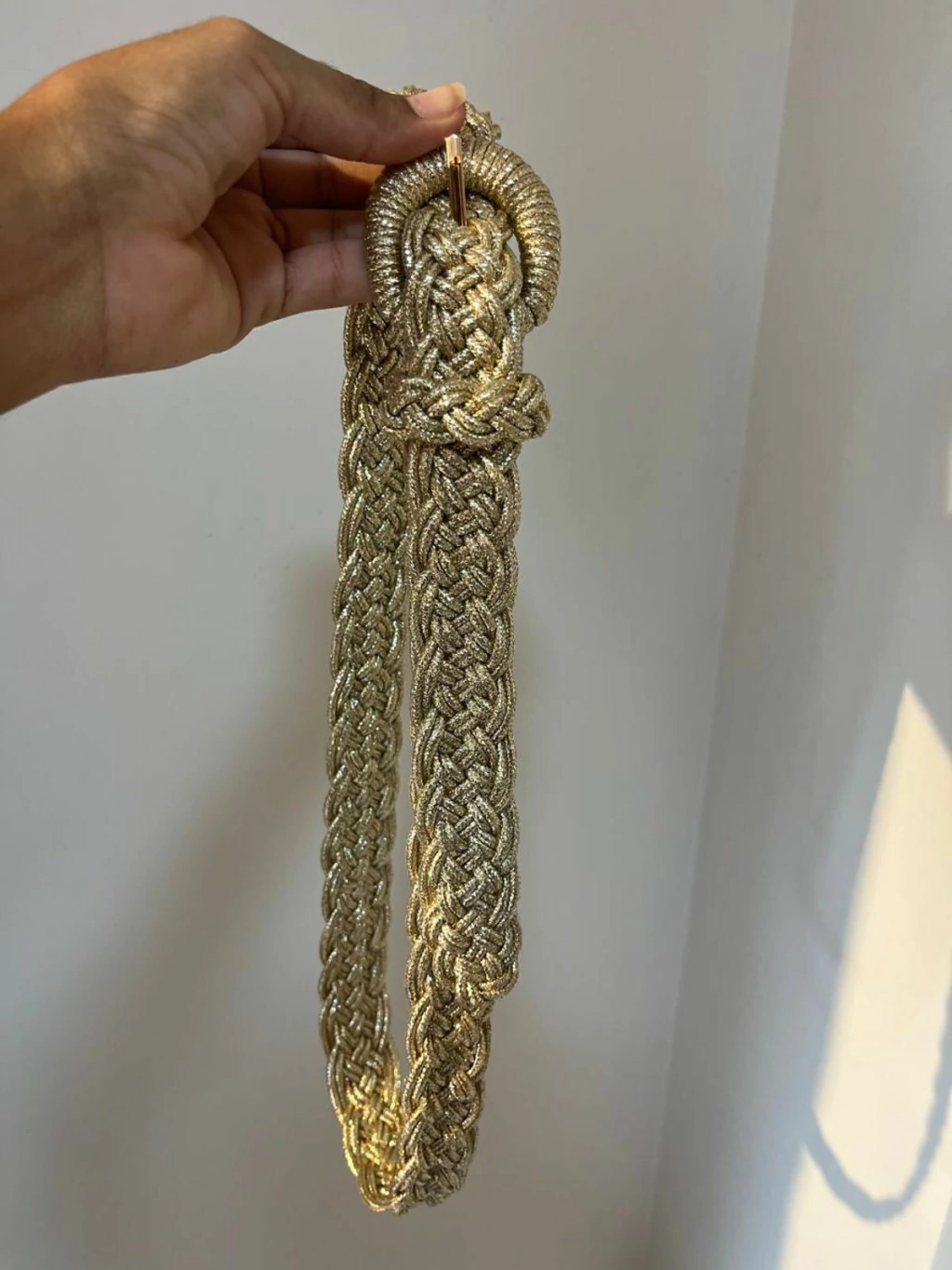 Este cinto trançado dourado que transforma qualquer look básico em uma produção elegante e sofisticada. Com acabamento artesanal em fios metalizados e fivela forrada no mesmo material, ele traz textura e brilho na medida certa.