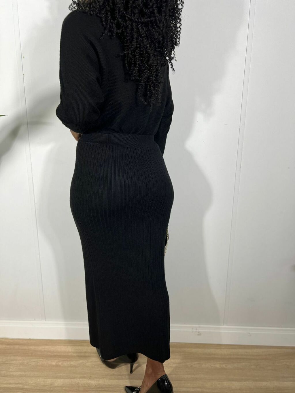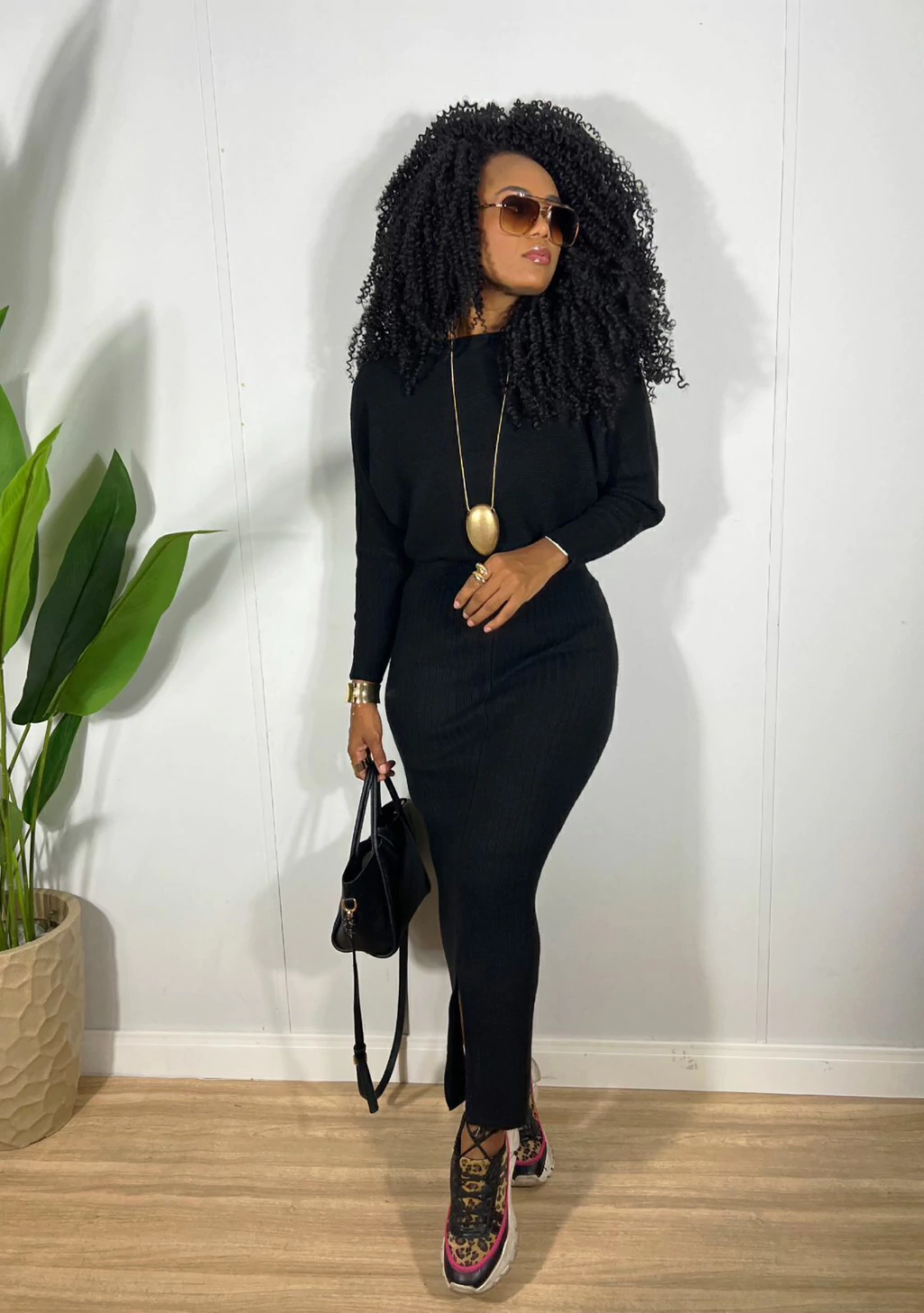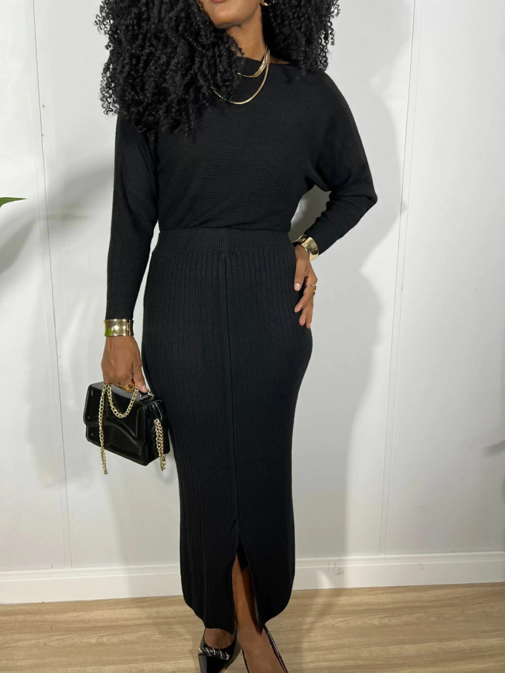 Conjunto em Tricô lanzinha com Blusa de Manga Longa e Saia Midi com Fenda