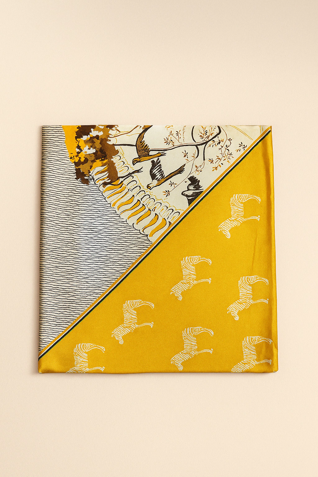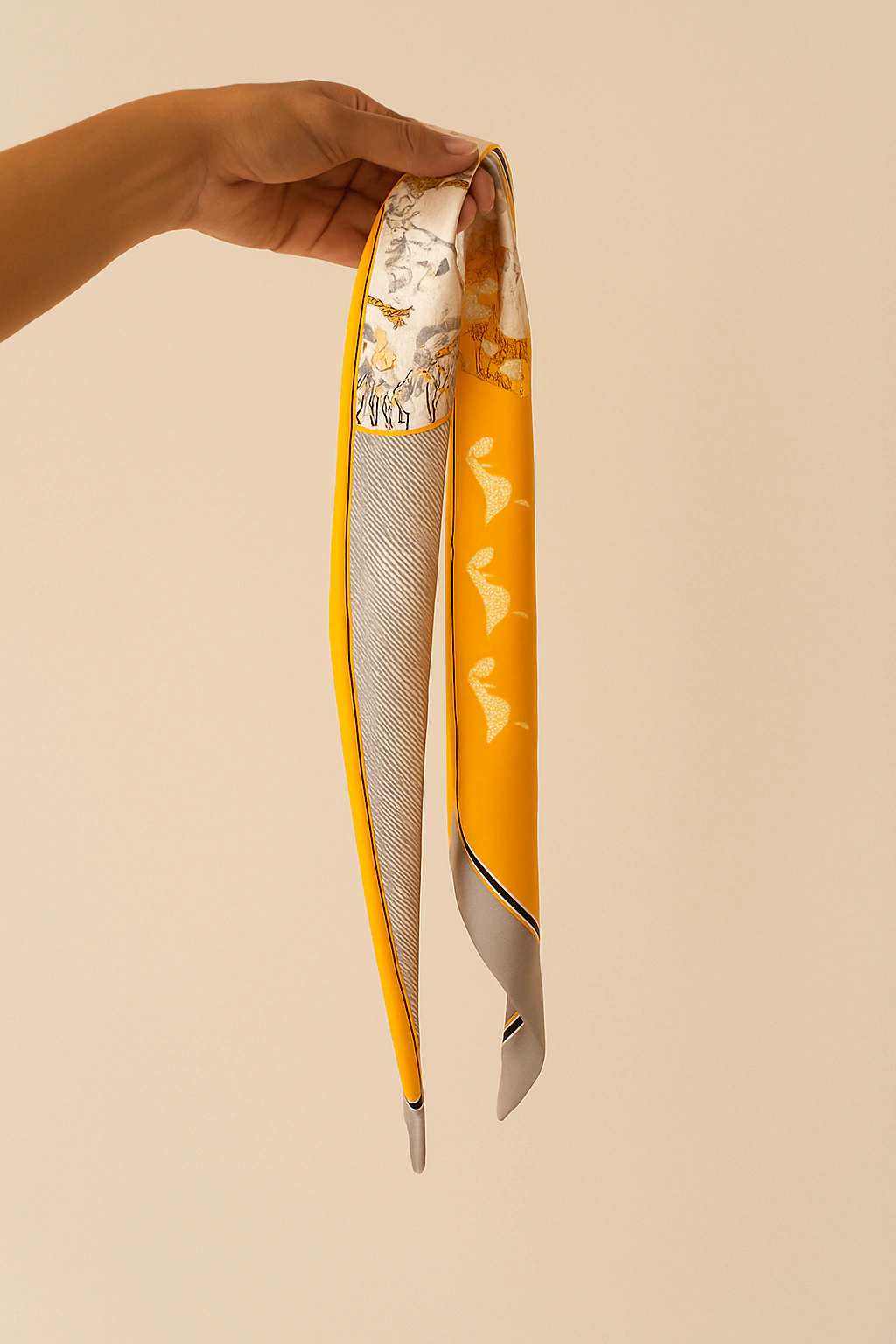 Lenço Brisa Savana é uma peça que carrega a leveza dos ventos da natureza e a força da fauna selvagem. Com fundo dourado mostarda, ele traz estampas de zebras em branco que simbolizam elegância e liberdade. Seu design é complementado por detalhes delicados de folhagens, pássaros e elementos naturais, que remetem à beleza e serenidade da savana. As bordas em cinza e preto finalizam com um toque de sofisticação e versatilidade.