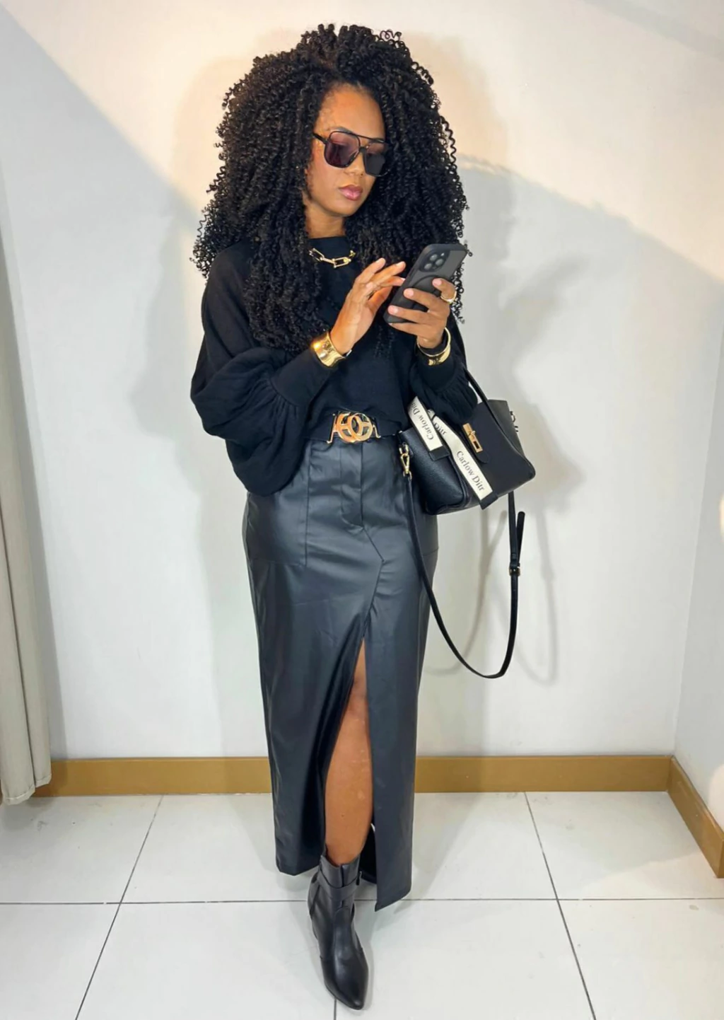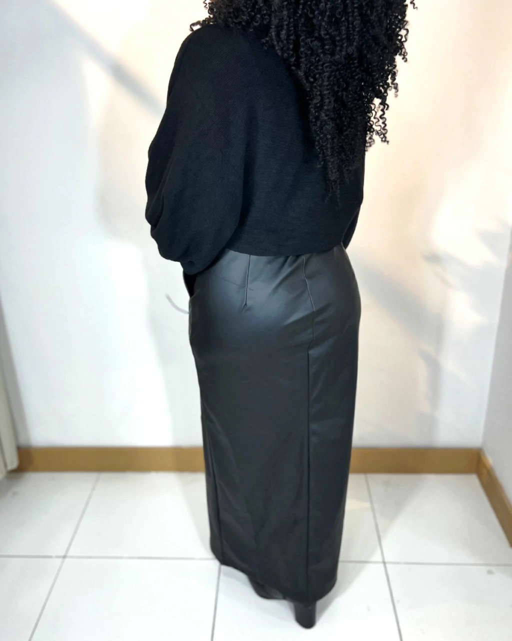 Saia midi em couro feke ,com corte reto e cintura alta, que valoriza a silhueta com sofisticação.