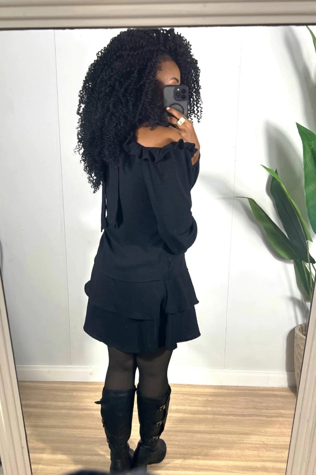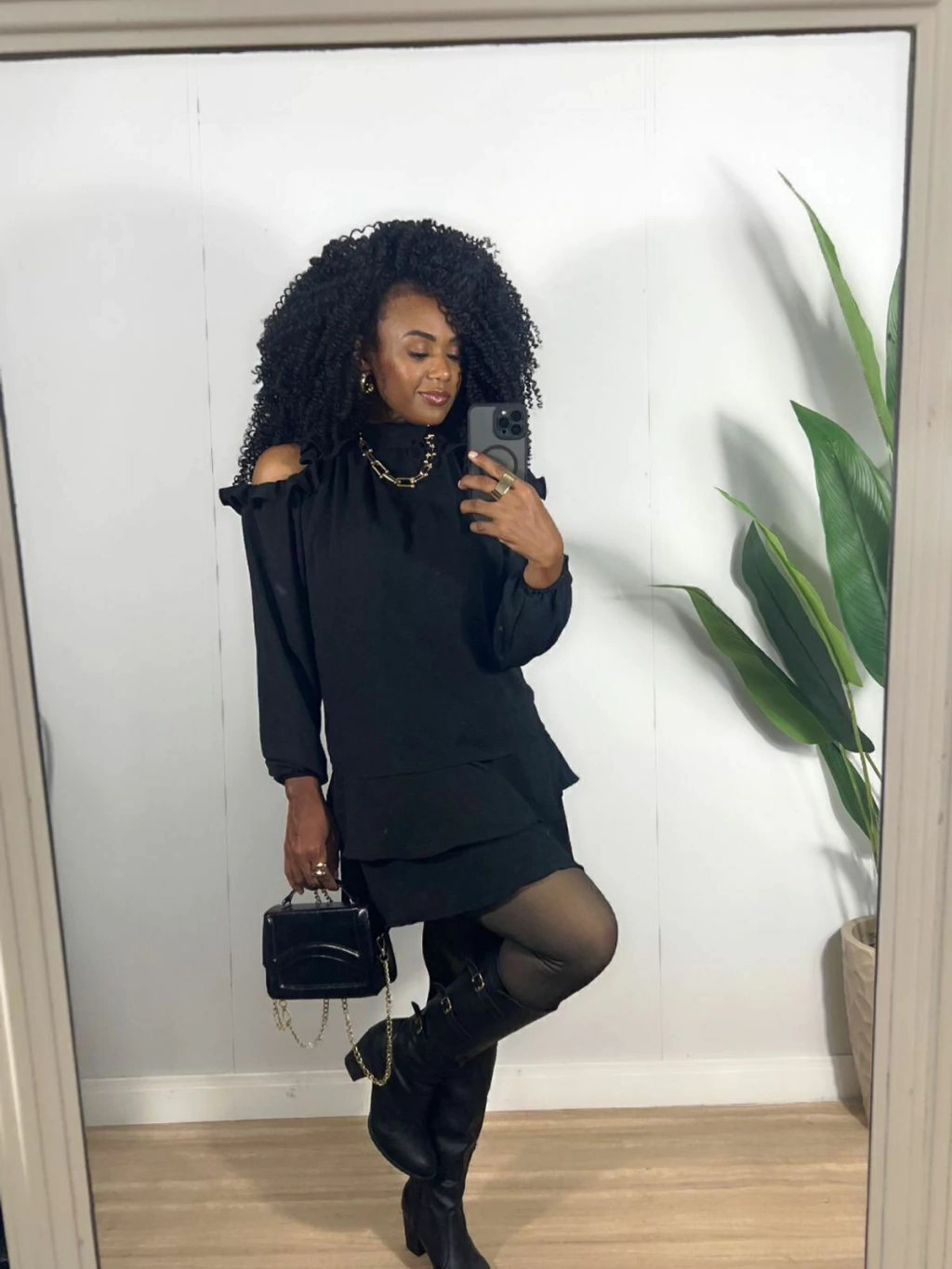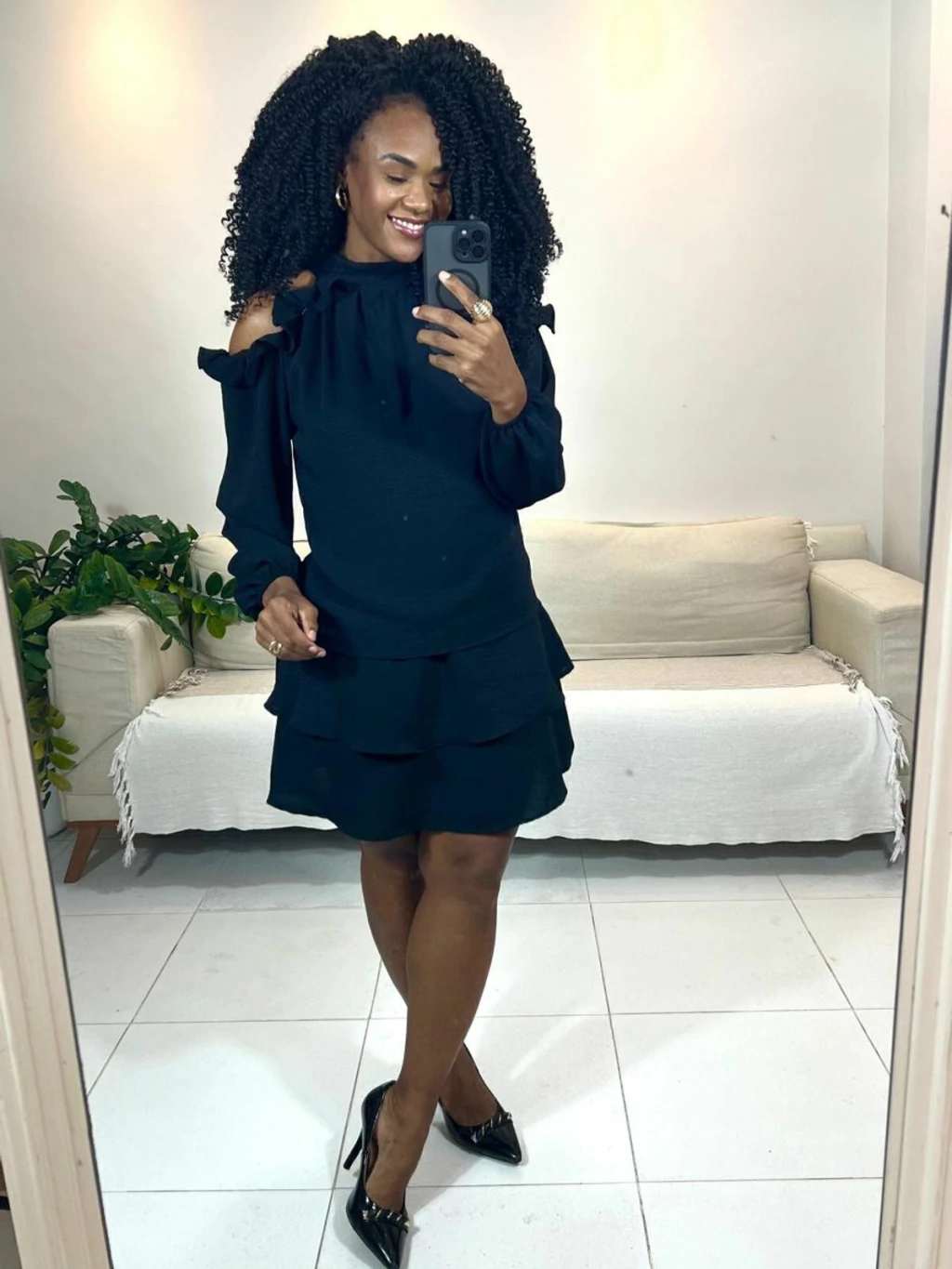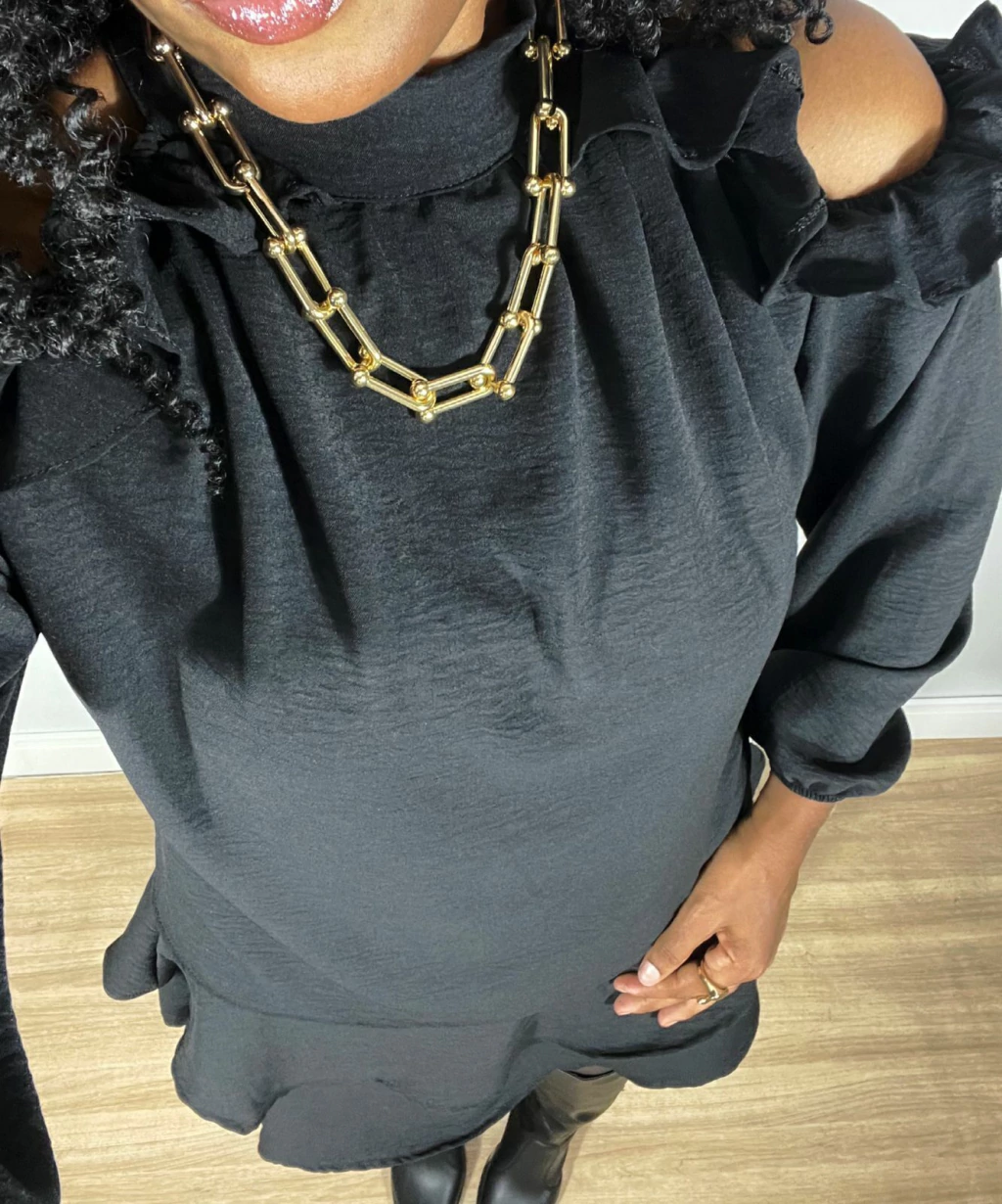 O chiffon traz leveza e fluidez à peça, enquanto os babados nas mangas e na barra acrescentam um toque romântico e delicado.
